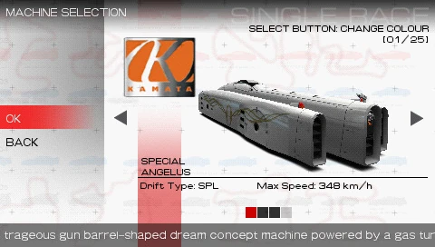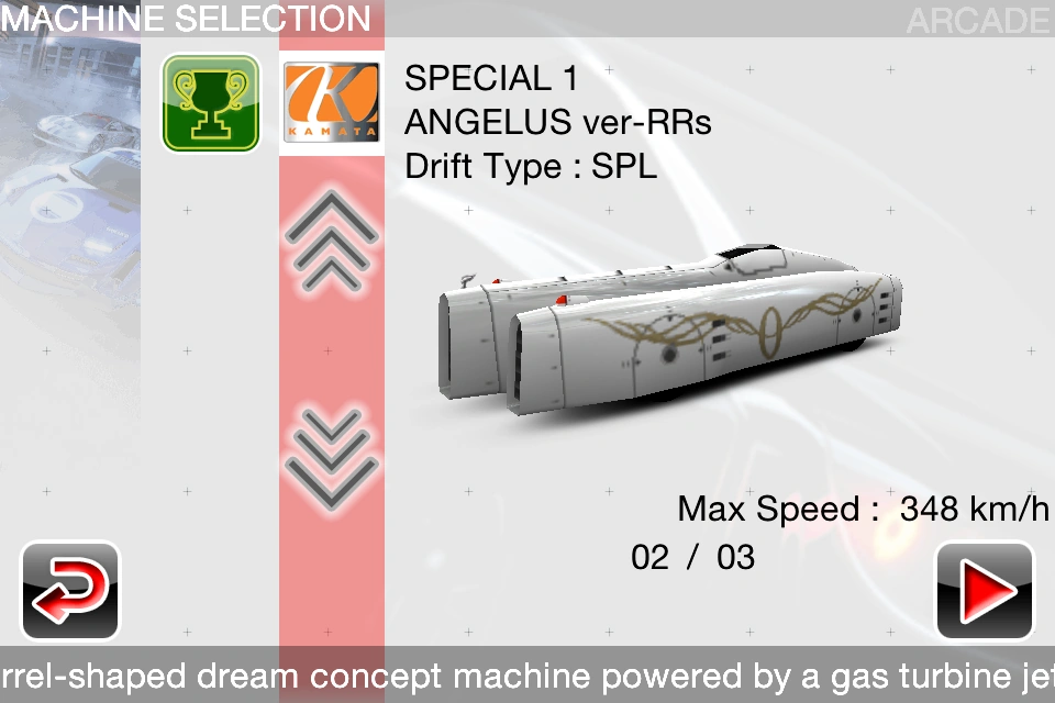 Like the Soldat Crinale, Ridge Racers 2 features the Angelus from Ridge Racer V. Although it does not retain it's incredibly high top speed from the game, it is still has very good acceleration and it's characteristic mild type drifting. However it has surprising traits in relation to Dynamic type machines, where you don't have to brake to drift, meaning it can take corners extremely tightly. Unlike its predecessor, it is unfortunately overshadowed by the performance of the Terrazi Wild Gang, as it has much lower top speed compared to it, though it is still a viable machine to be used in Max Tour.