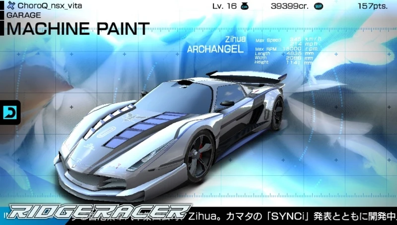 The Angelus is replaced in Ridge Racer Vita by the Zihua Archangel, taking design from the Ridge Racer 6 version of the Angelus.